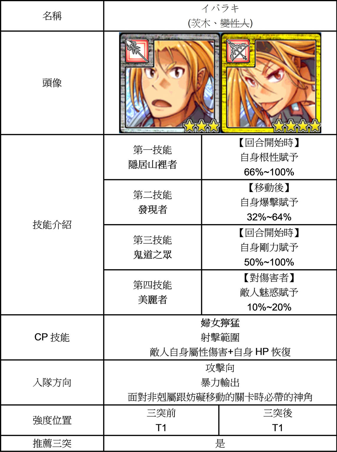| 補貼位置 | 補貼於輸出與防禦上 鬼練滿之後背後一格守護為100%非常適合保人。 本身輸出有剛力跟CP發動的自身攻擊強化。 |