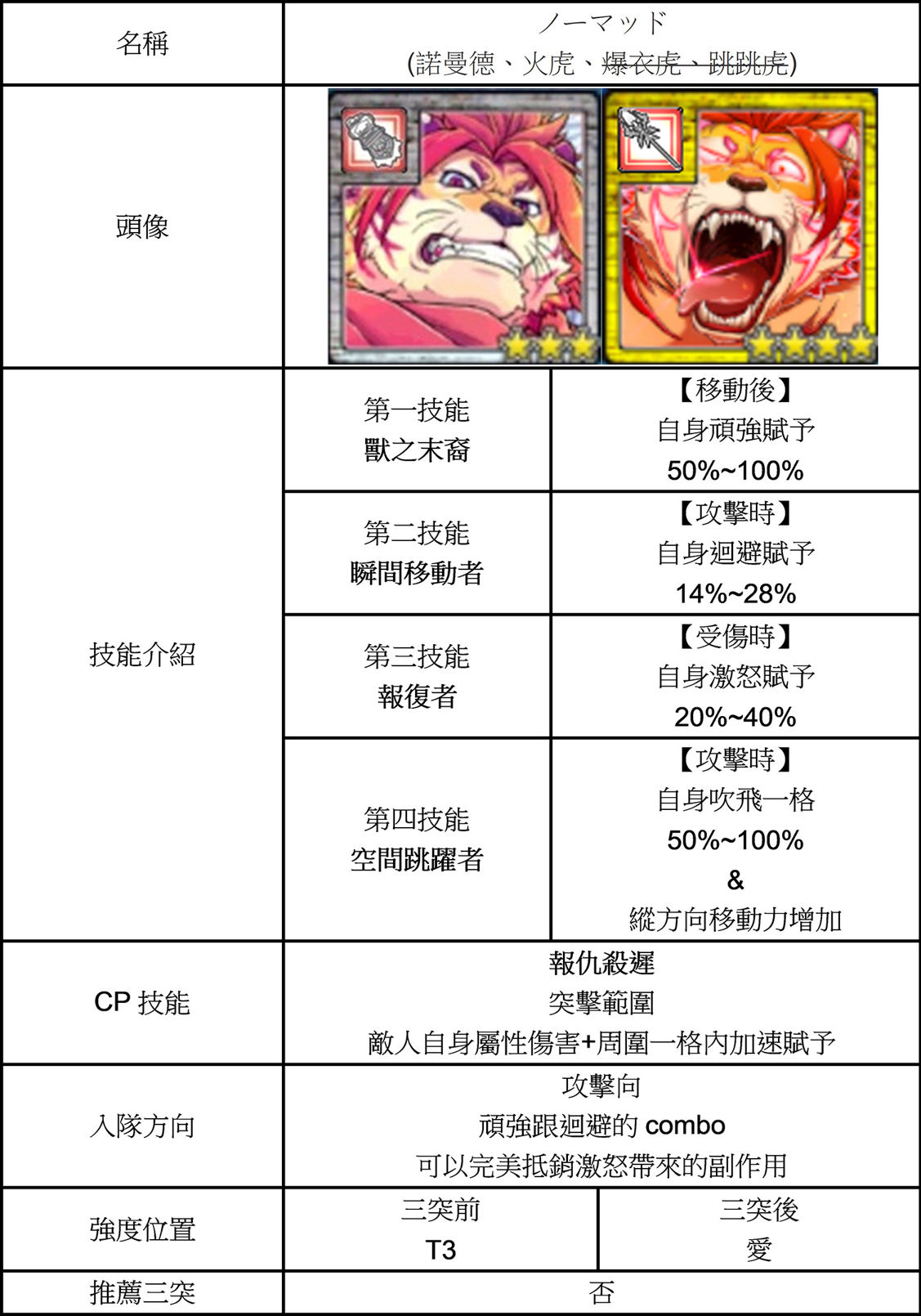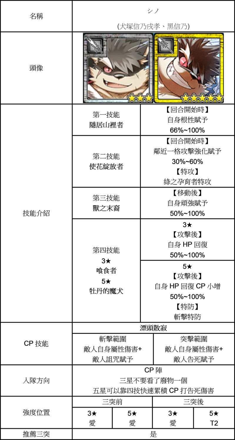 | 技能總評 | 【3星】 自廢一技,獸末可以勉強擋住激怒帶來的副作用。 三突後獲得狂氣傳染者。 攻擊時旁邊一格與自己貼鬥志與+CP 可做不動砲塔使用。 【5星】 天覆大志者。 攻擊時周圍一格含自己鬥志賦予跟+CP。 |