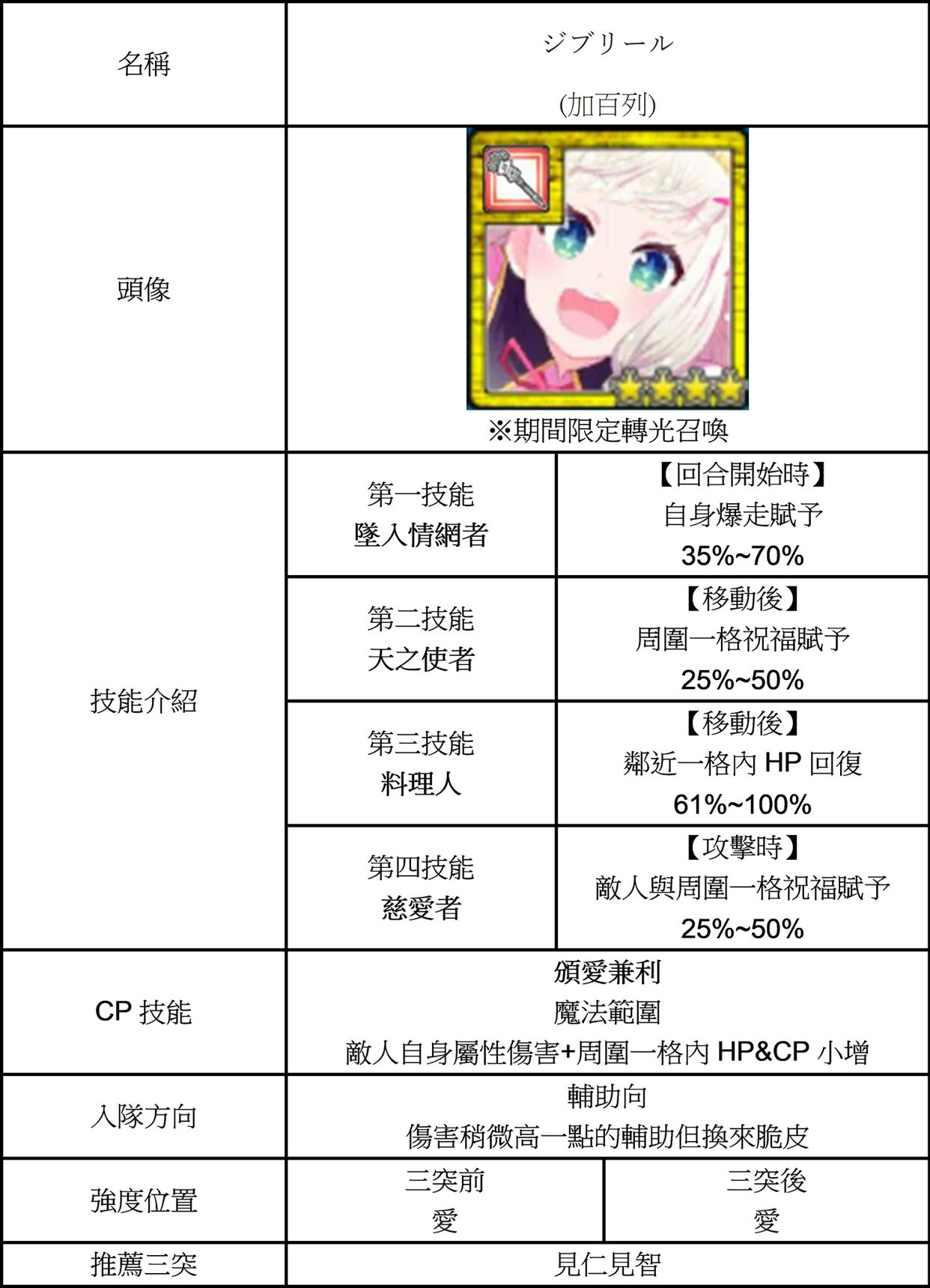 | 入隊方向 | 1.坦克 2.CP陣,搭配上其他CP加速的角色可以無限的施放CP技。 |