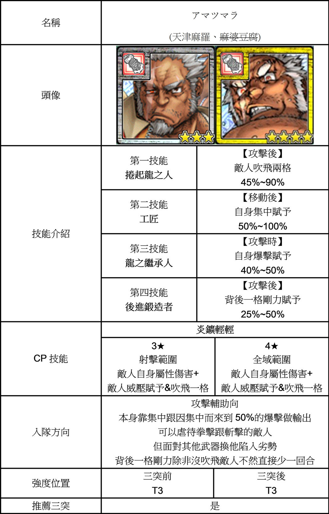 | 技能總評 | 移動後自貼加速。 攻擊時鄰近一格CP增加。 回合開始時前方三列鬥志賦予。 三突後獲得四天國的統治者。 移動後鄰近一個攻擊強化跟+CP。 |