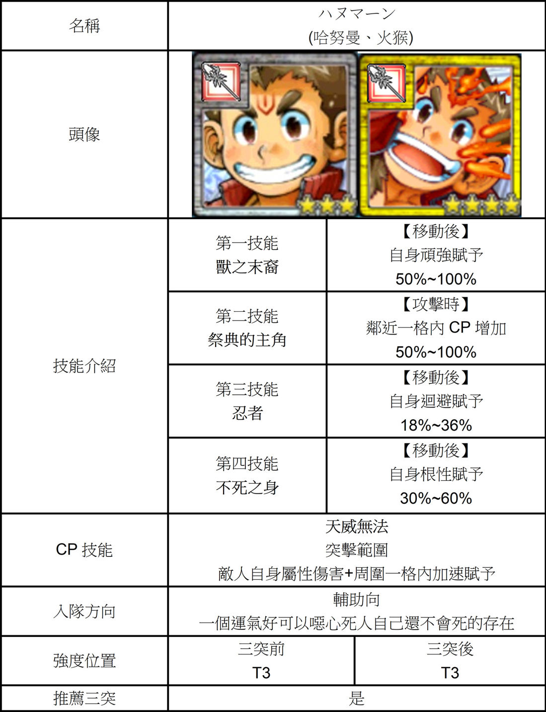 | 技能總評 | 獸末+山籠者=超級坦克 40%背後兩格含自己上鬥志可以讓隊伍獲得一定的輸出能力。 三突後獲得英雄服侍者。 背後一格迴避賦予與補血600 可以完完全全的保護背後的輸出。 |