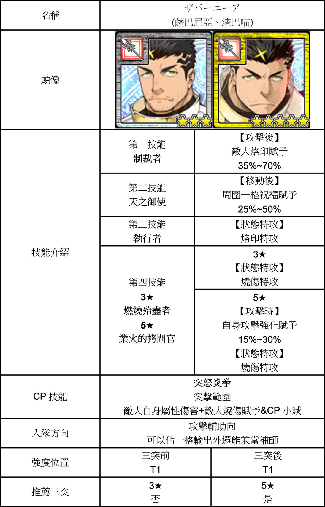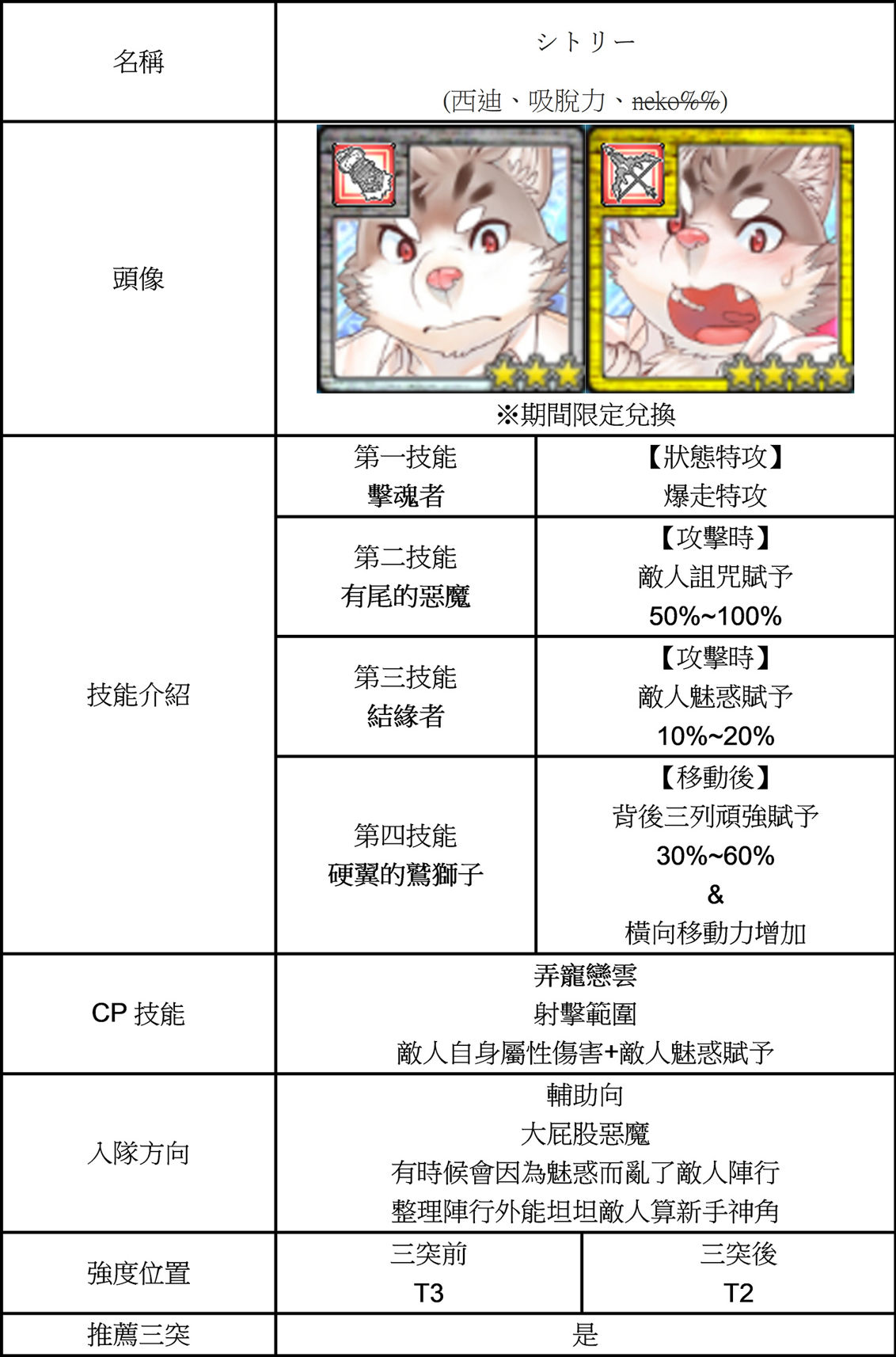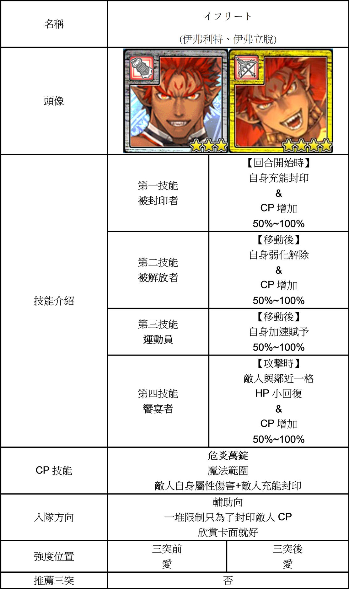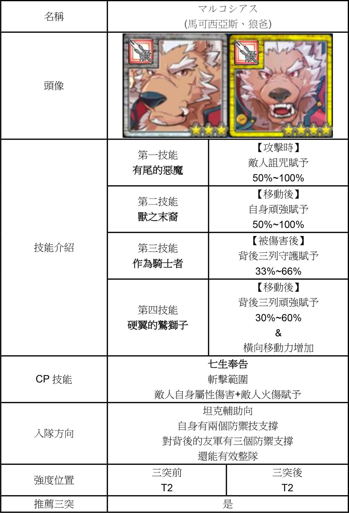 | 技能總評 | 【3星】 移動後周圍一格奮起賦予。 攻擊時敵人恐怖賦予。 攻擊後鄰近一格弱化解除。 【4星】 回合開始時自補CP。 攻擊時敵人恐怖賦予。 攻擊後鄰近一格弱化解除。 三四星三突後皆獲得有尾的惡魔。 攻擊時敵人詛咒賦予。 |