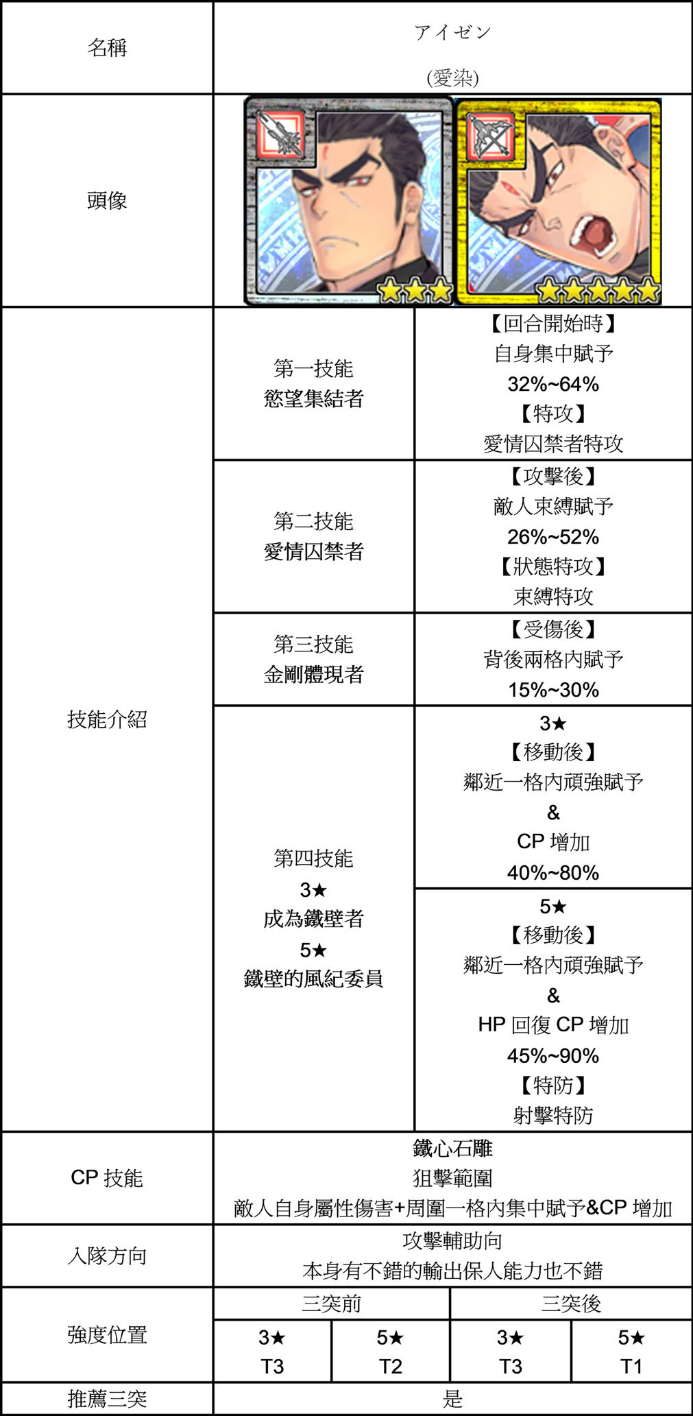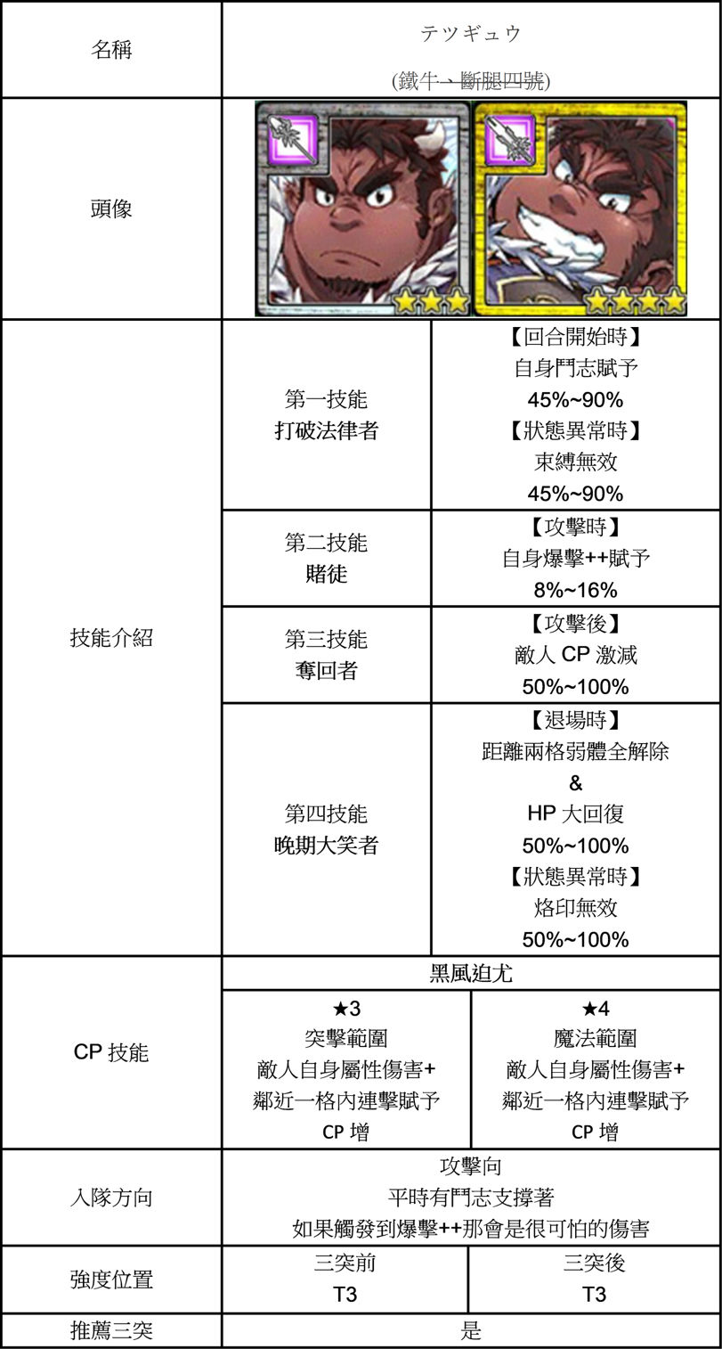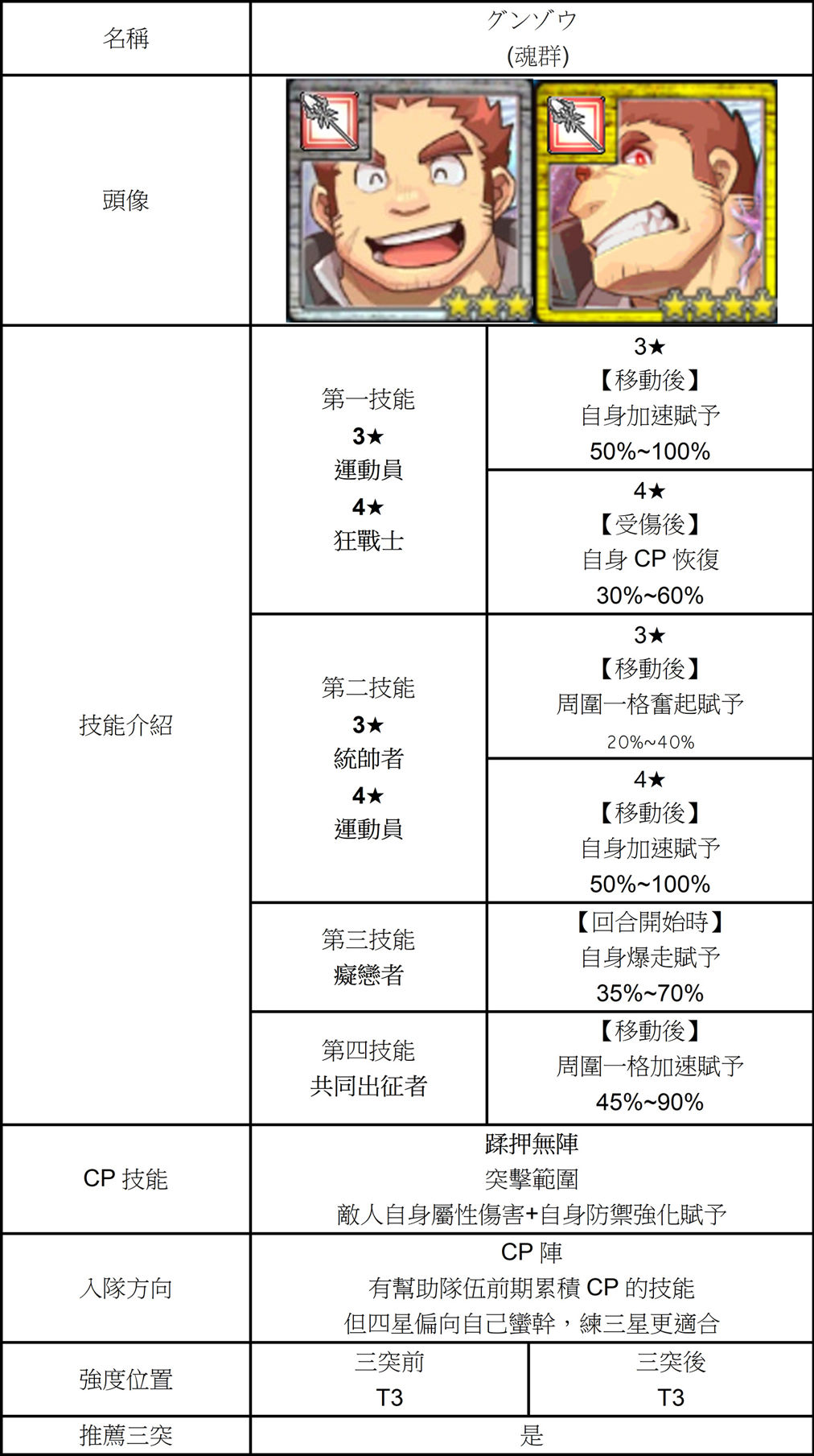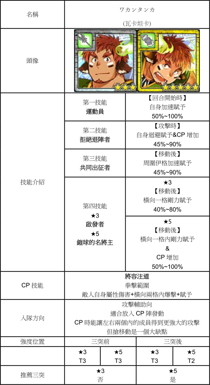 | 技能總評 | 【3星】 移動後自補CP。 回合開始時周圍兩格+CP。 攻擊後前方一格+CP。 三突後獲得狂氣感染者。 攻擊時鄰近一格含自身鬥志賦予跟+CP。 【5星】 三突後獲得狂奔的指揮者。 攻擊時前方兩格含自己鬥志賦予跟+CP。 |