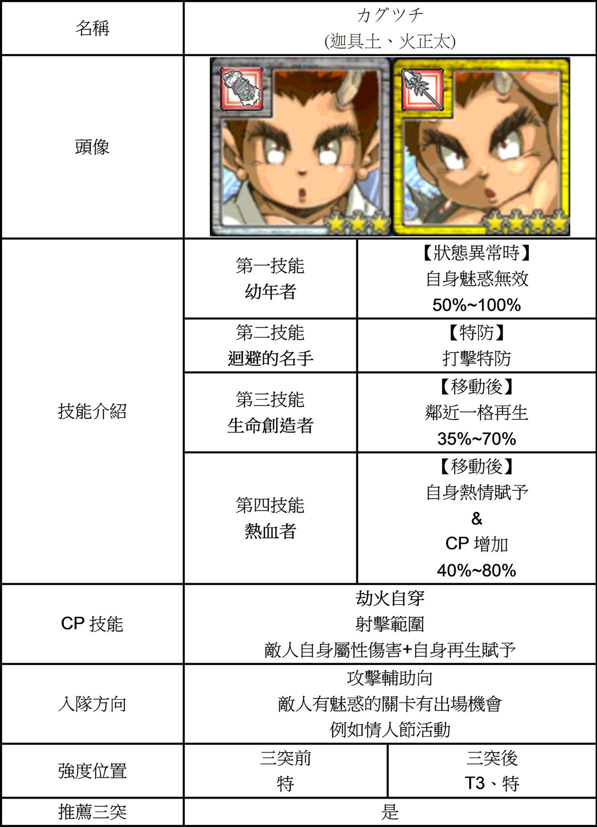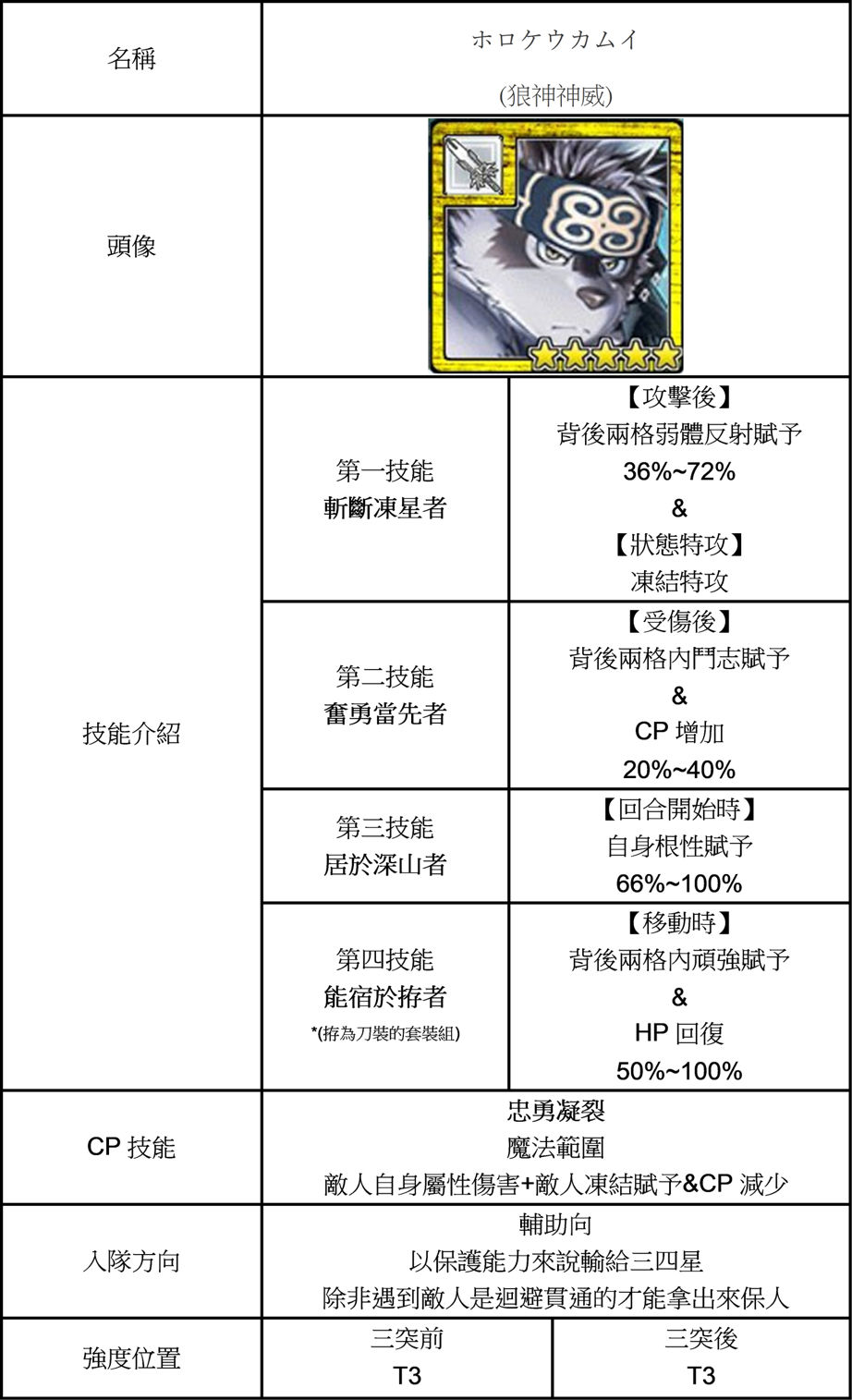 | 技能總評 | 攻擊後敵人"毒"賦予。 回合開始自貼剛力,被揍自補CP。 三突後獲得護主者 被揍後後方一格守護賦予。 |