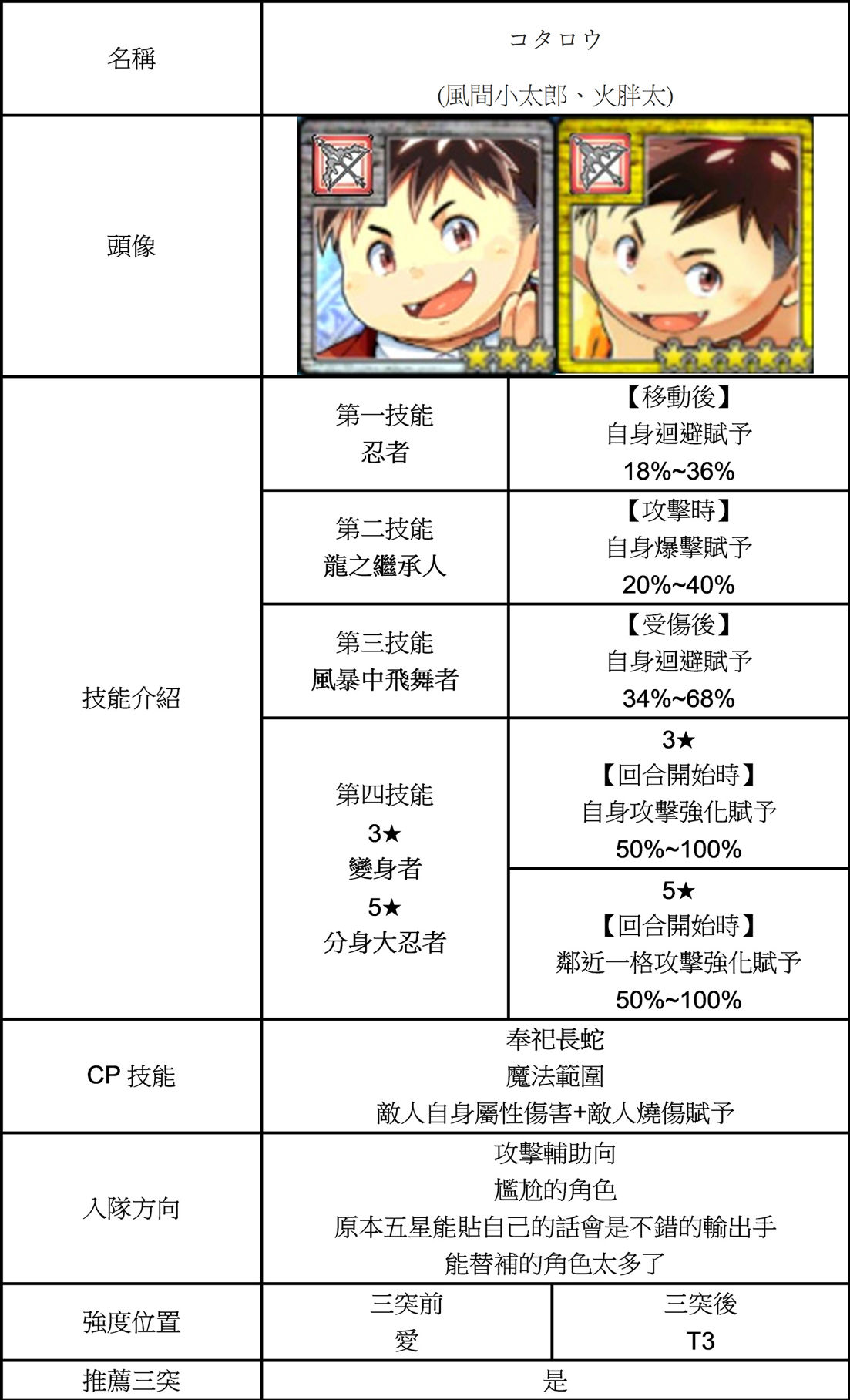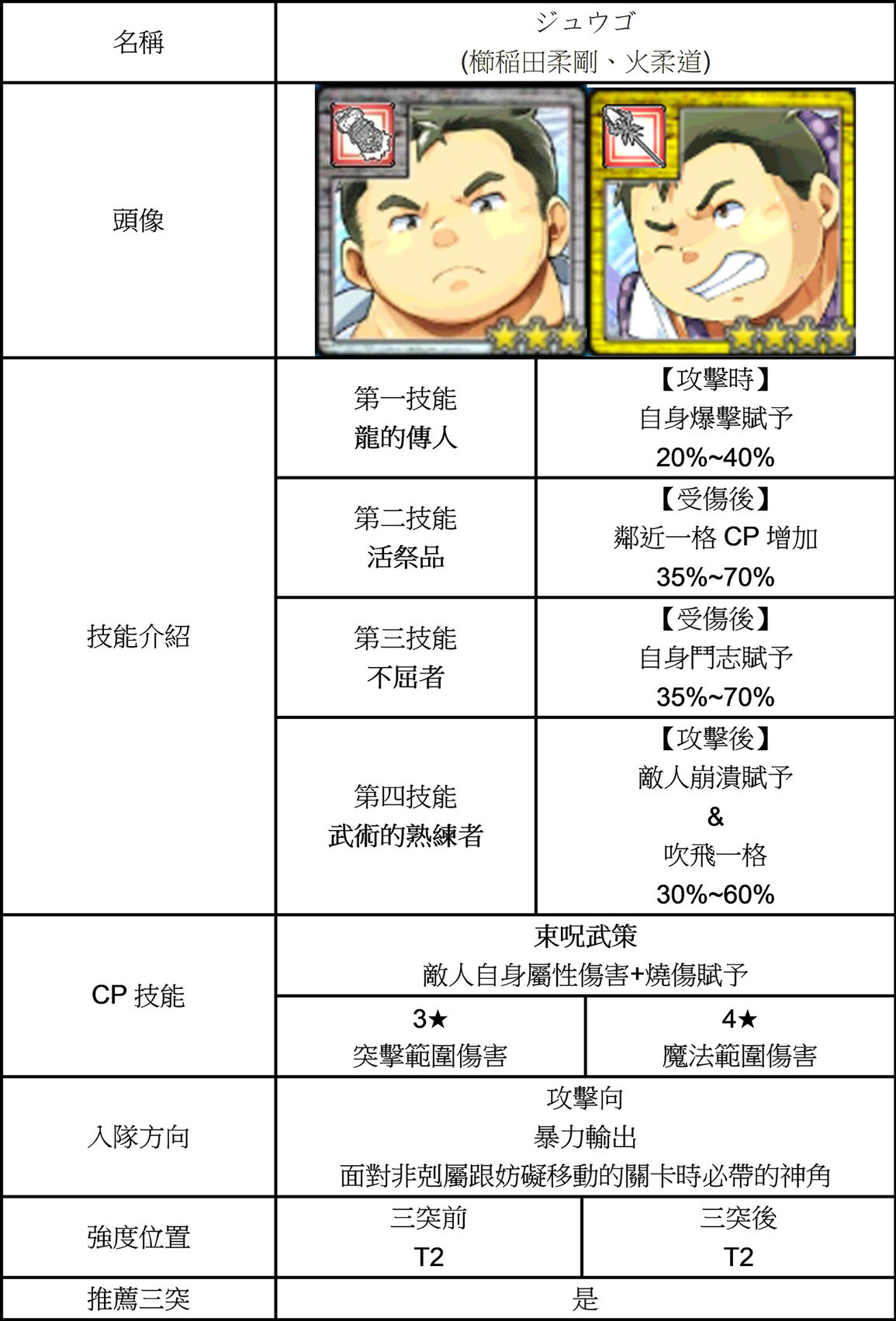 | 技能總評 | 移動後自貼頑強。 打擊特防,被揍後背後兩格迴避賦予。 三突後獲得撕打者 移動後自貼剛力跟CP增加。 |