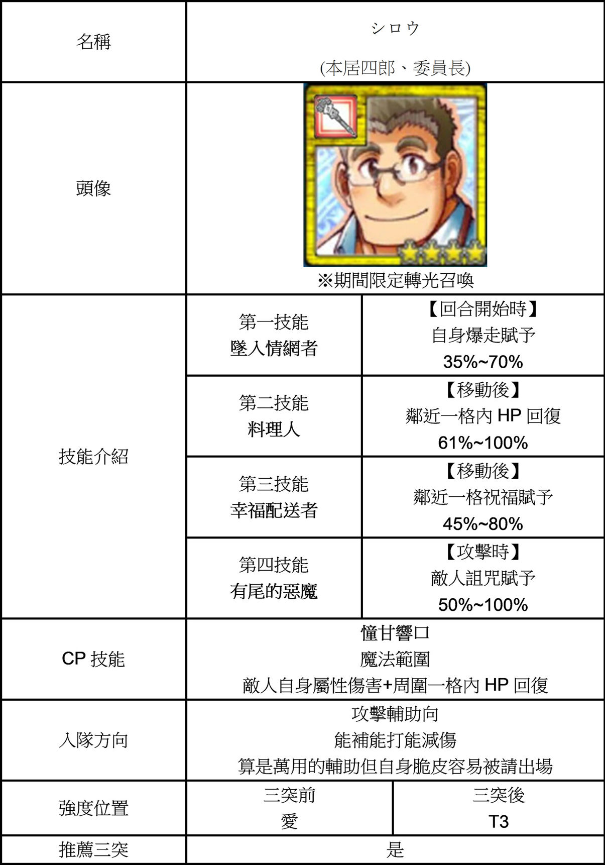 | 技能總評 | 因活動而生的卡片,自廢兩技,獸末提供坦度 三突的戰場壓制者 回合開始時周圍一格含自身防禦強化跟+CP。 滿技之後可以提供全隊隊伍穩定的坦度及加速CP技觸發。 |