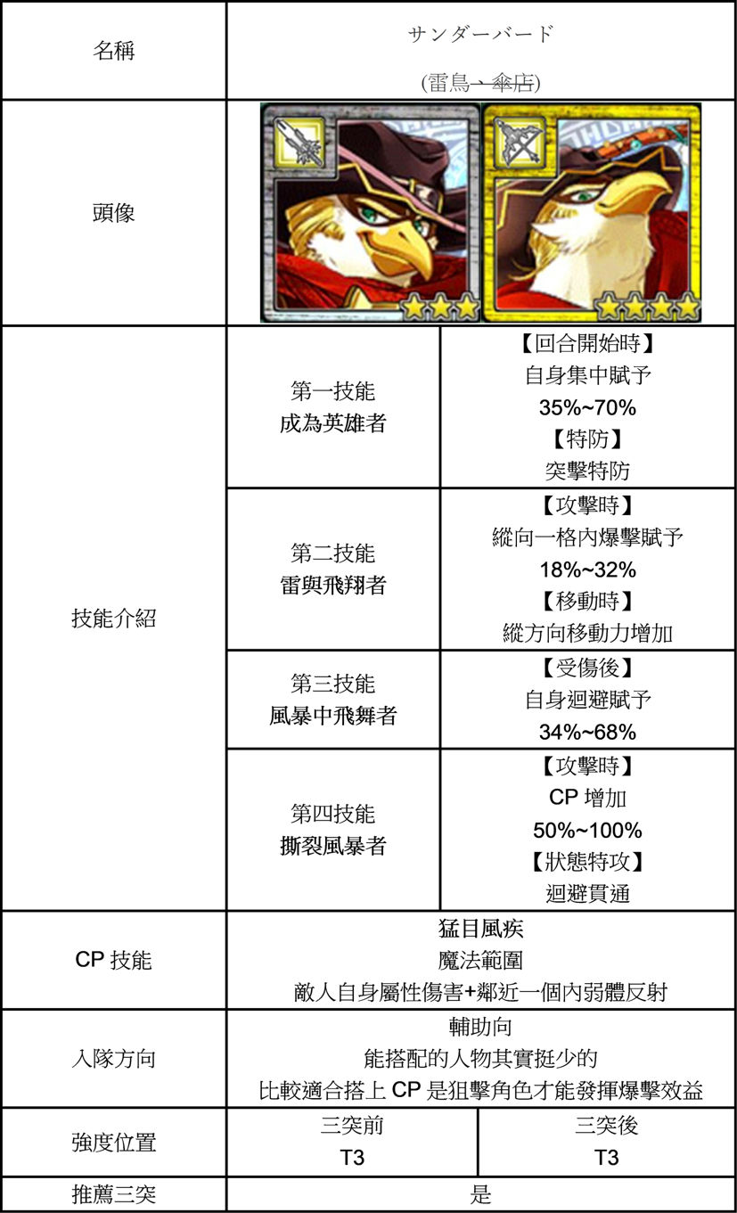 | 技能總評 | 移動後自貼頑強。 回合開始時自貼加速。 被揍森77。 三突後獲得必中者。 攻擊時爆擊跟持續迴避貫通。 |