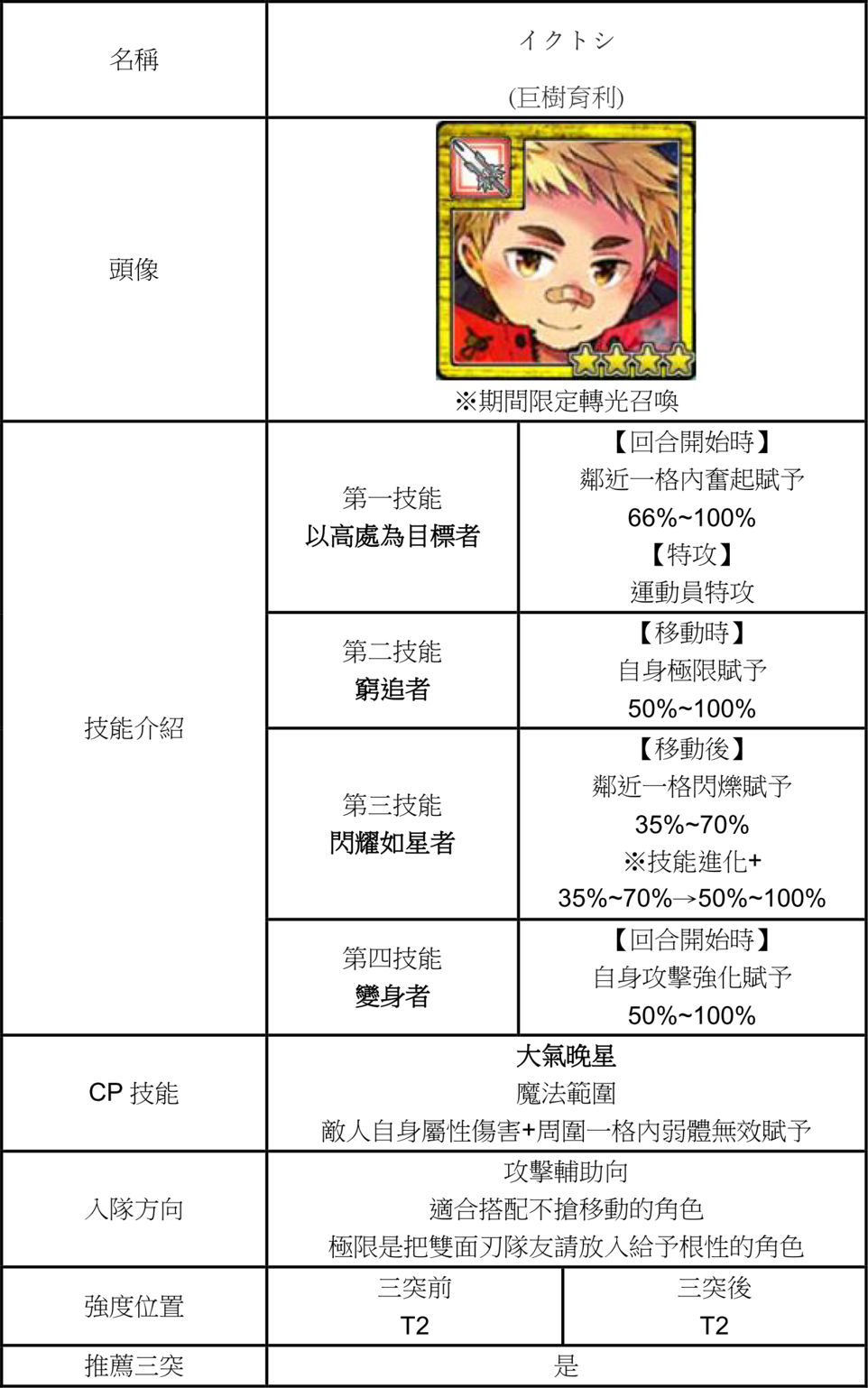 | 技能總評 | 移動後自補CP跟自貼加速。 攻擊後鄰近一格弱化解除。 三突後獲得星之璀璨者。 移動後鄰近一格閃爍賦予。 |