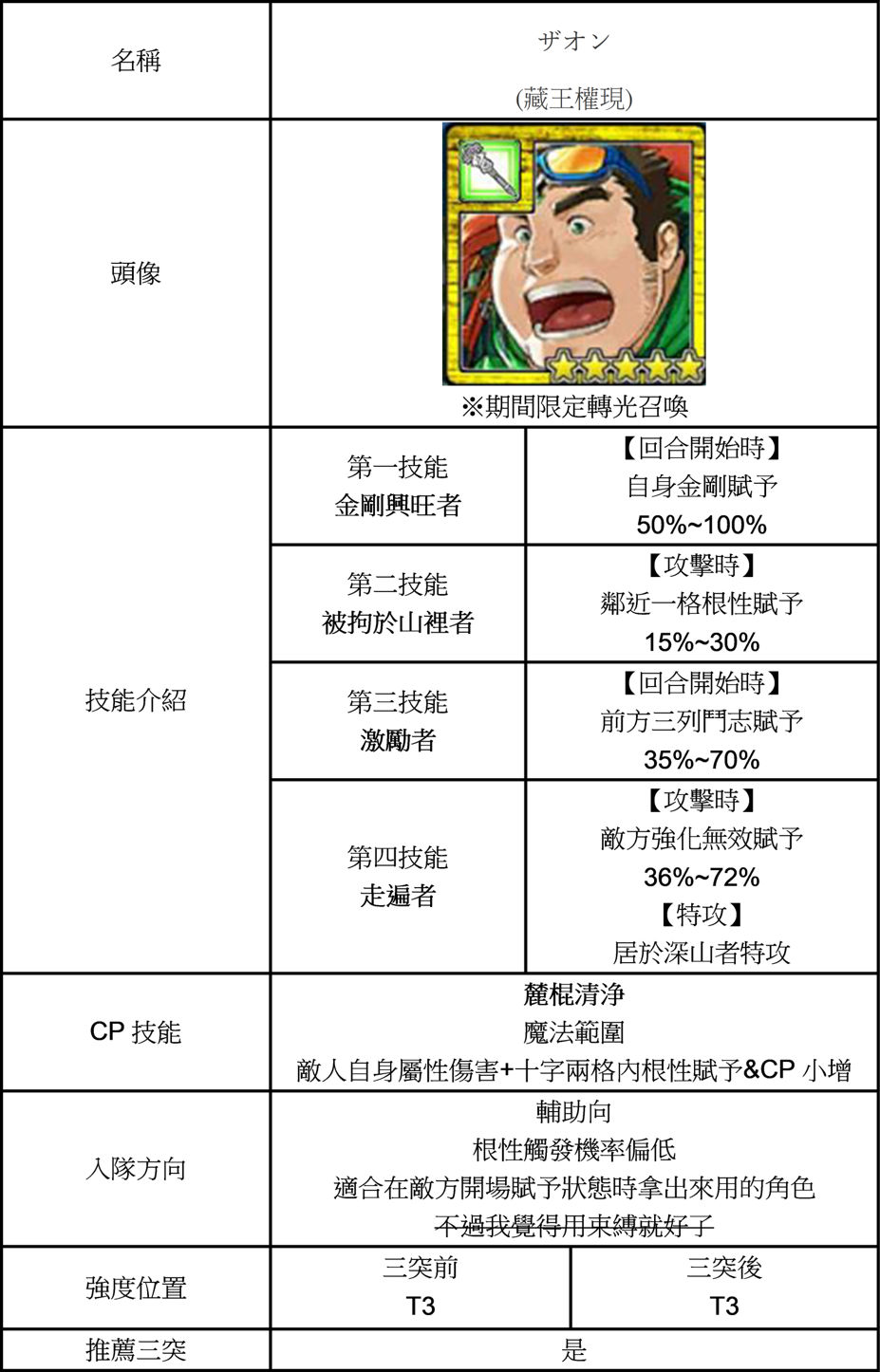 | 技能總評 | ☆期間限定 回合開始自貼根性。 被揍後背後兩格含自身鬥志、金剛賦予跟+CP。 三突後獲得山的治理者。 對住在山裡者特攻。 |