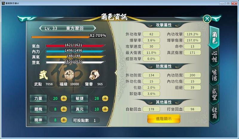 這是我33等目前的數值(沒點九玄大法、後天真氣)