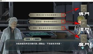 大部分時候對話選項尾端會有派系提示,有的時候沒有,魔門的還算好找,最兇最惡毒的選下去就對了,但佛道兩派有時候都會弄錯(汗