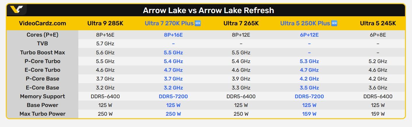 規格方面,270K Plus 由原本 265K 的 8P+12E 升級為 8P+16E;250K Plus 則從 6P+8E 提升至 6P+12E,強化多執行緒表現。官方已確認預設記憶體支援速度由 DDR5-6400 提升至 DDR5-7200,TDP 維持 125W。先前傳言價格可能會維持對應型號,也就是多了小核心,但售價不變,相對型號可能直接調降售價。